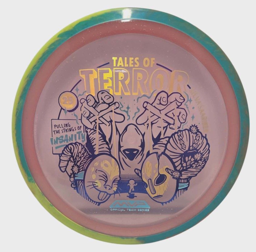 Beware the one pulling the strings during the Finnish Harvest Festival! Stamp newcomer Damian White unveils his first MVP stamp for this Halloween comic inspired design on the Particle Proton Insanity, a warning that some ornaments created for this event are a bit more ghoulish than they appear. The Insanity is a stable-understable driver that players will find easy to manipulate, with average power throws being remarkably straight with forward pushing fade, and higher power throws resulting in precise hyzer-flips, turnovers, and beautiful s-lines. Don’t let the course pull your strings – grab a Particle Proton Insanity today and prove who the true master is.