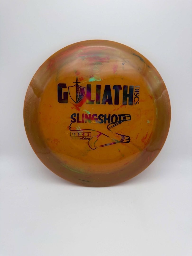 The Goliath Discs Slingshot is a big distance, 13-speed driver that is not for the feint of heart. The Slingshot is a straight flyer, featuring some turn and some fade. This disc has the potential to take your distance game to the next level.